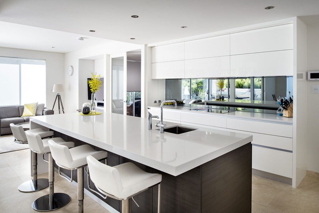 Glossy cabinets reflect more light than other finishes. The reflective properties of high glass make the space appear larger and more open and are chosen for smaller kitchens.